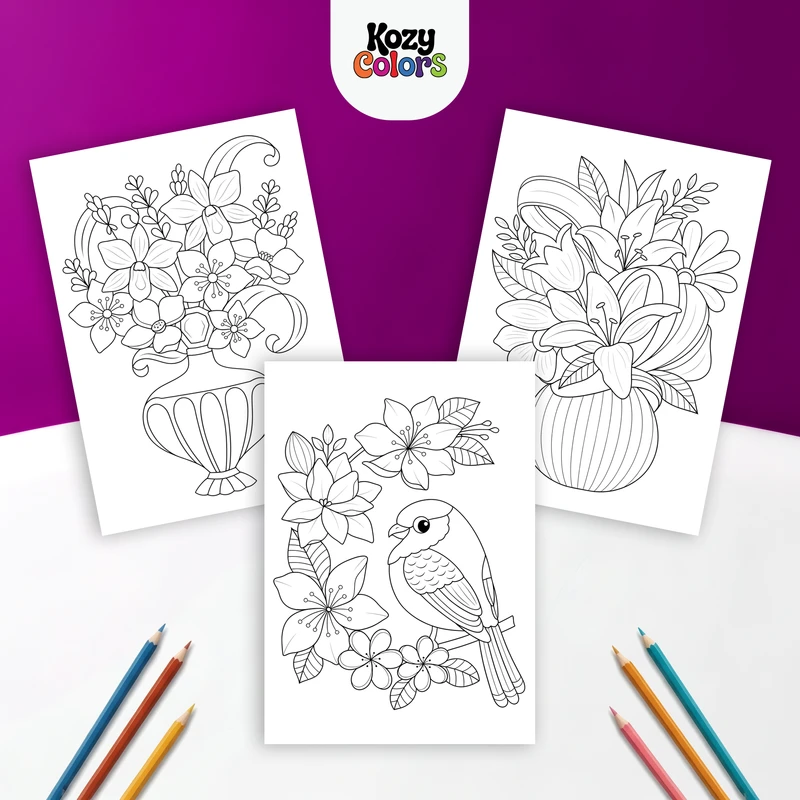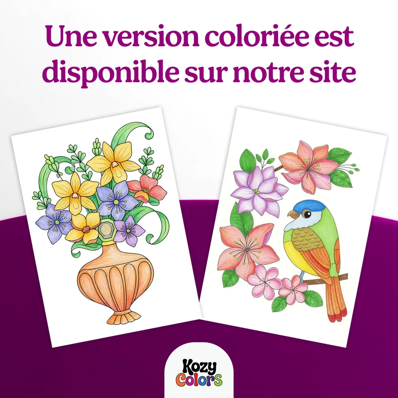 نسخة ملونة لكل تصميم، لتستوحي منها الألوان وتنمّي ذوقك الإبداعي أثناء التلوين